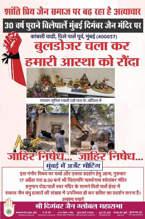 याबाबत अखिल भारतीय जैन अल्पसंख्याक महासंघाचे राष्ट्रीय अध्यक्ष ललित गांधी यांनी महाराष्ट्र राज्याचे मुख्यमंत्री देवेंद्र फडणवीस यांना मुंबई येथील विलेपार्ले पूर्वेतील जैन मंदिर पाडणाऱ्या अधिकाऱ्यांना तात्काळ निलंबित करण्याची आणि मंदिराच्या पुनर्बांधणीची कारवाई करावी यासाठी निवेदन दिले आहे यात आदरणीय साहेब,आज १६ एप्रिल २०२५ रोजी मुंबई महानगरपालिकेने विलेपार्ले (पूर्व) येथील दिगंबर जैन मंदिर पाडल्याची बातमी देशभर पसरली आहे.